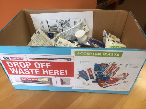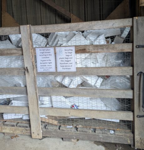 The following materials are now being recycled at camp: plastic, cardboard, paper, glass, metal, e-waste, batteries, Styrofoam, plastic films, and toothbrushes/toothpaste tubes/floss containers.